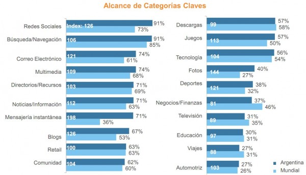 Asimismo, el estudio indica que el 57 por ciento de los argentinos consume Internet diariamente, seguido por un 22 por ciento que lo hace de 4 a 6 veces por semana y un 17 por ciento que lo hace de 2 a 3 veces respectivamente. Con relación al uso que se hace de Internet, la investigación arrojó como resultado que el envío y recepción de mails es la actividad predilecta para los argentinos (87%), seguida por el ingreso a redes sociales (70%) y por mirar fotos o descargar videos (55%), en tercer puesto. Junto a estas actividades, se posiciona la lectura de noticias (53%), escuchar (46%) y bajar (34%) música, participación en Chats (31%), consultas de mapas, rutas y direcciones (27%), ver el estado del tiempo (24%), juegos online (22%) y utilización de servicios bancarios online (16%).
